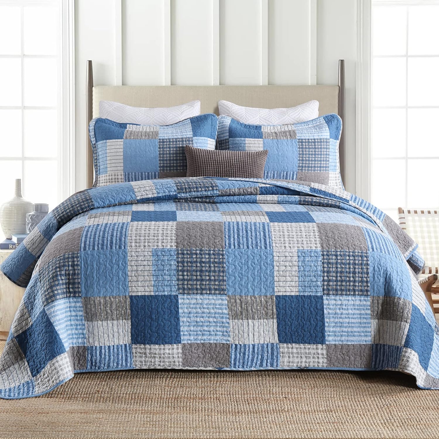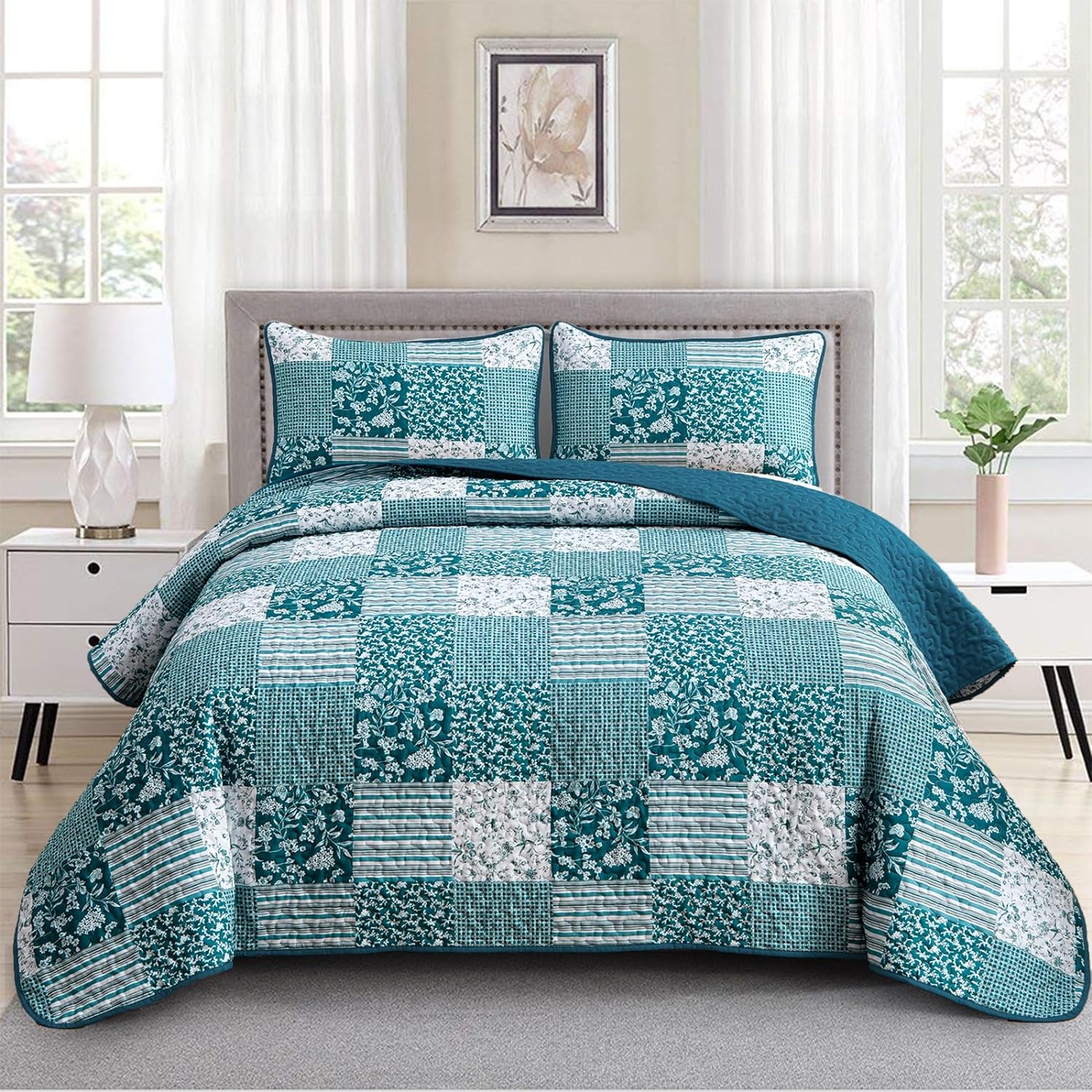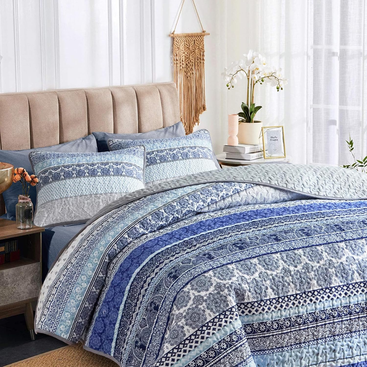 Blue Boho Quilt Set Queen Size,3 Pieces Plaid Floral Bedspread Coverlet Set for All Season,Patchwork Reversible Bedding Set Queen 90"x96"