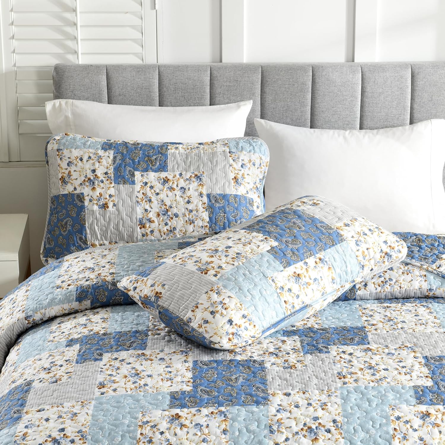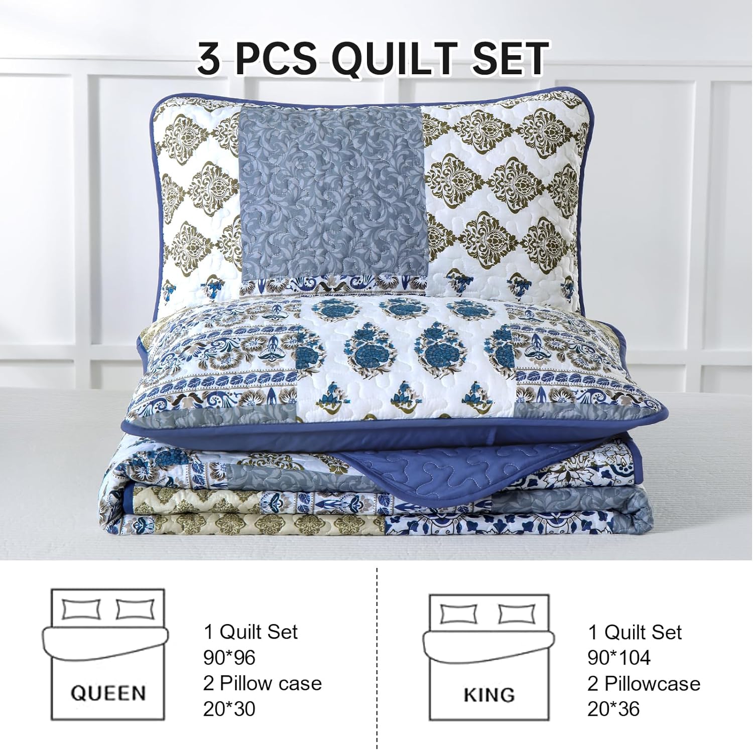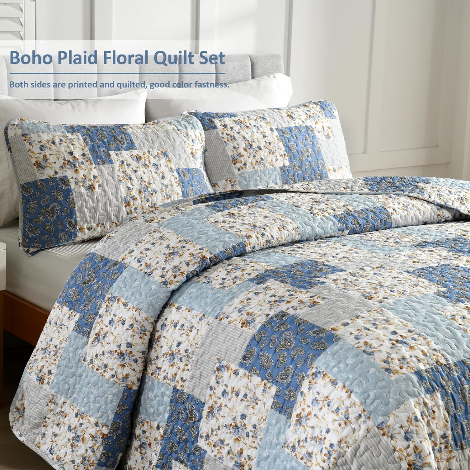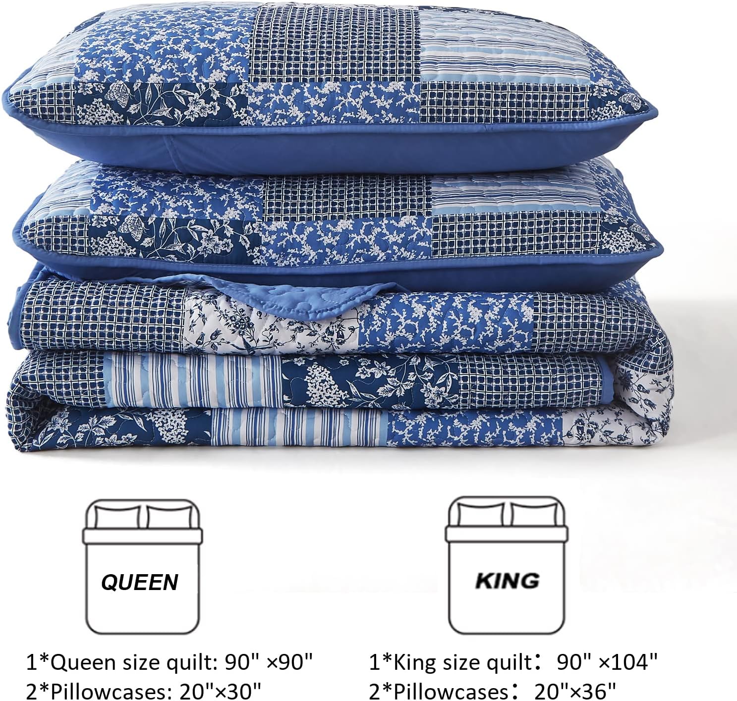 - 【Plaid Patchwork Quilt Set】:3 piece plaid quilt set queen size includes 1 Quilt (90"x96") and 2 Pillowcases (20"x30"),blue floral quilts set bedding is a perfect choice for home decor,blue white plaid quilts bedspread giving your bedroom unique aesthetic and invigorate your room spread immediately.