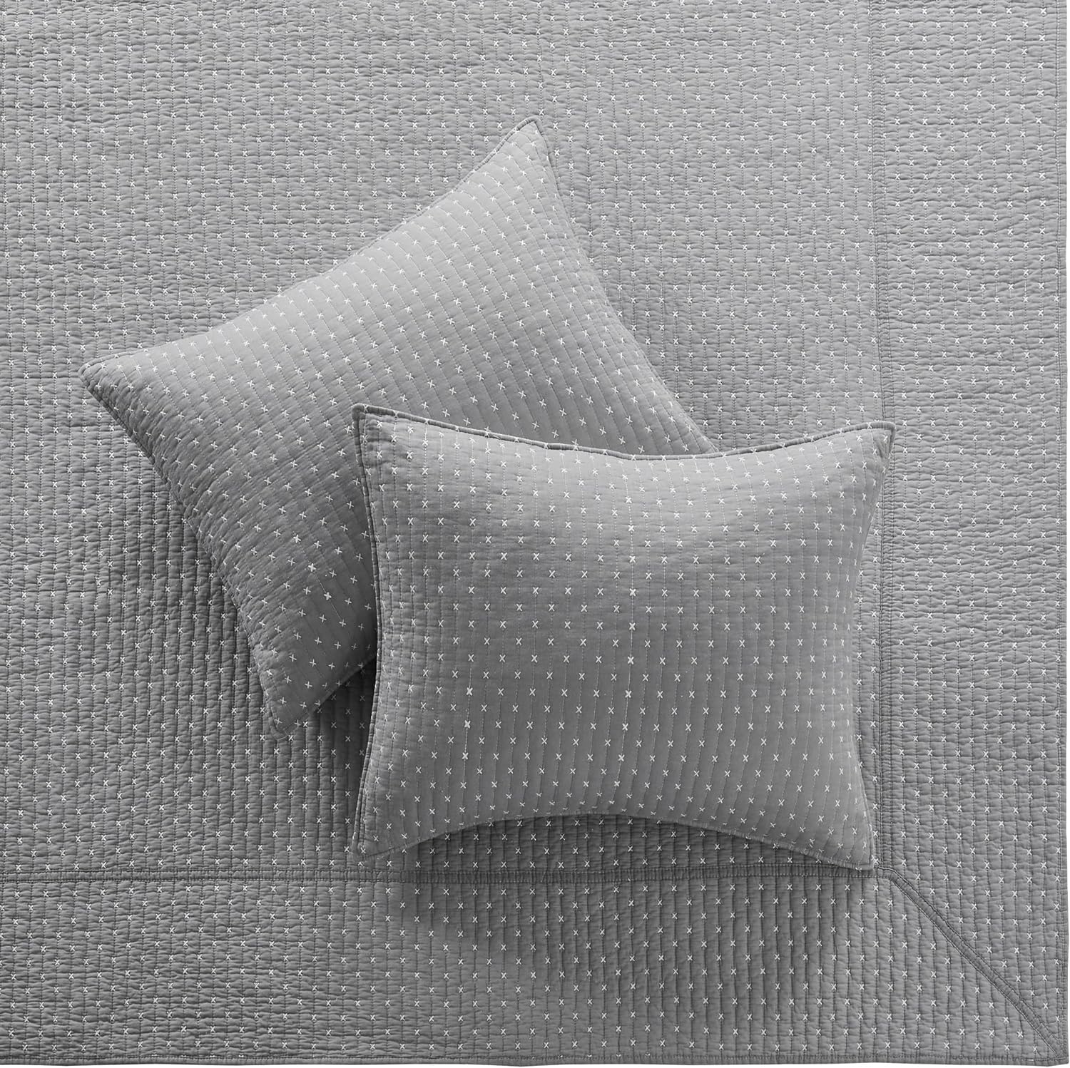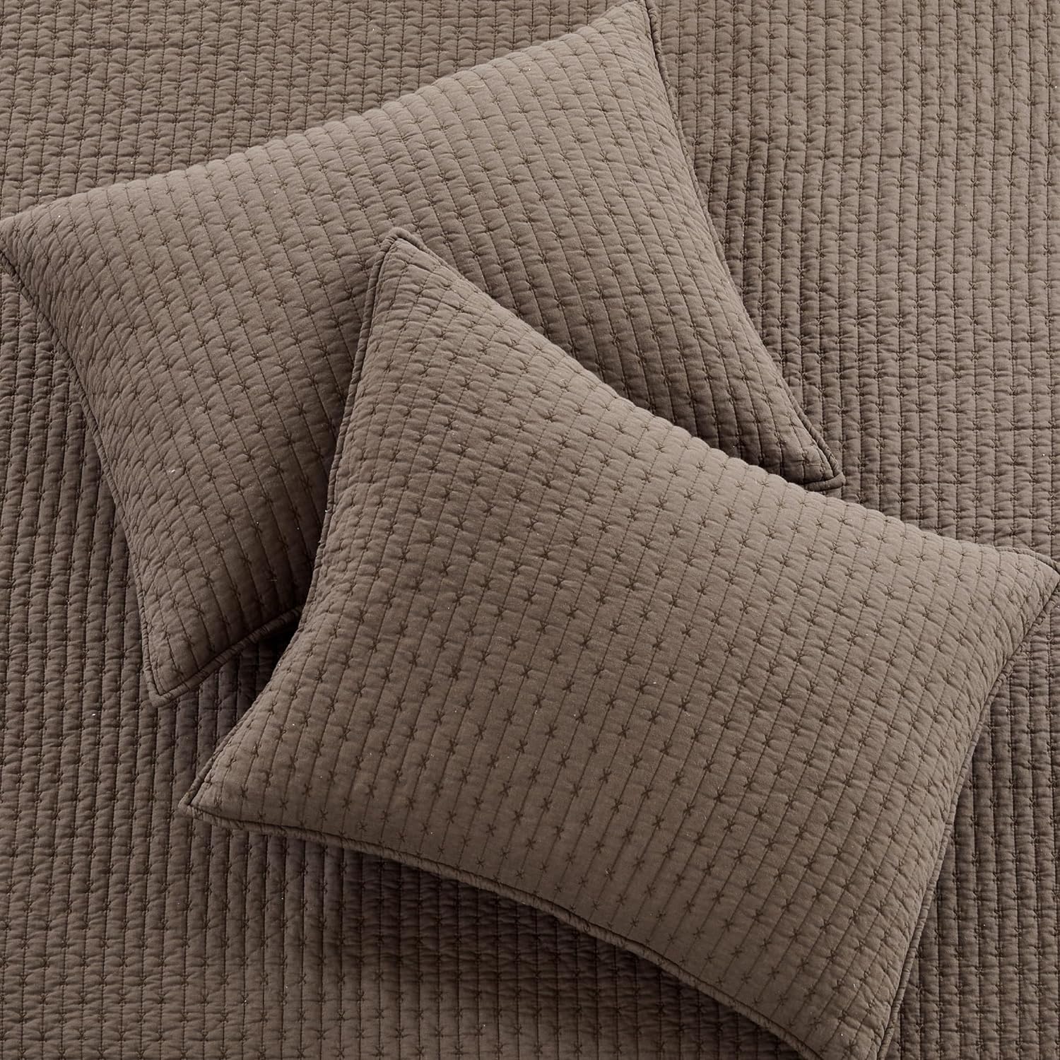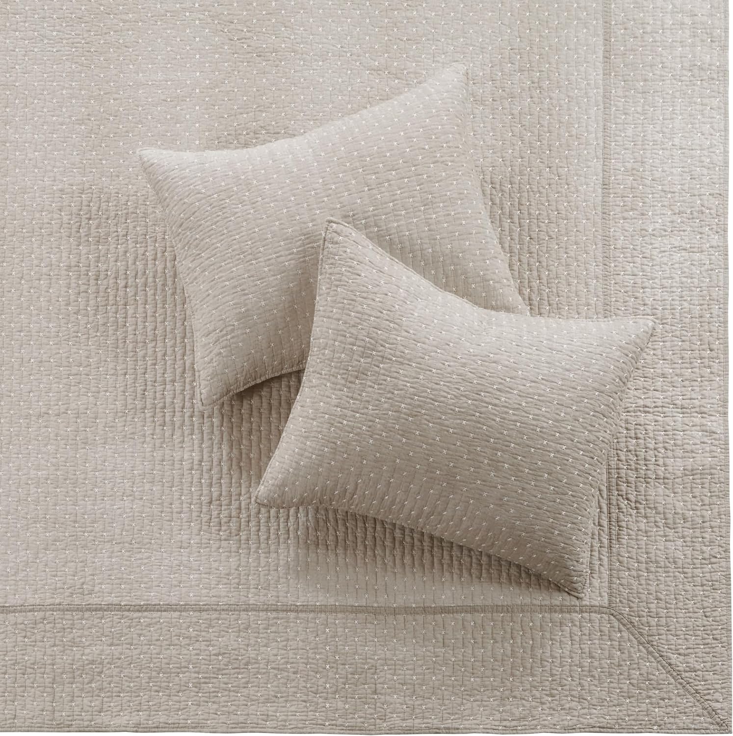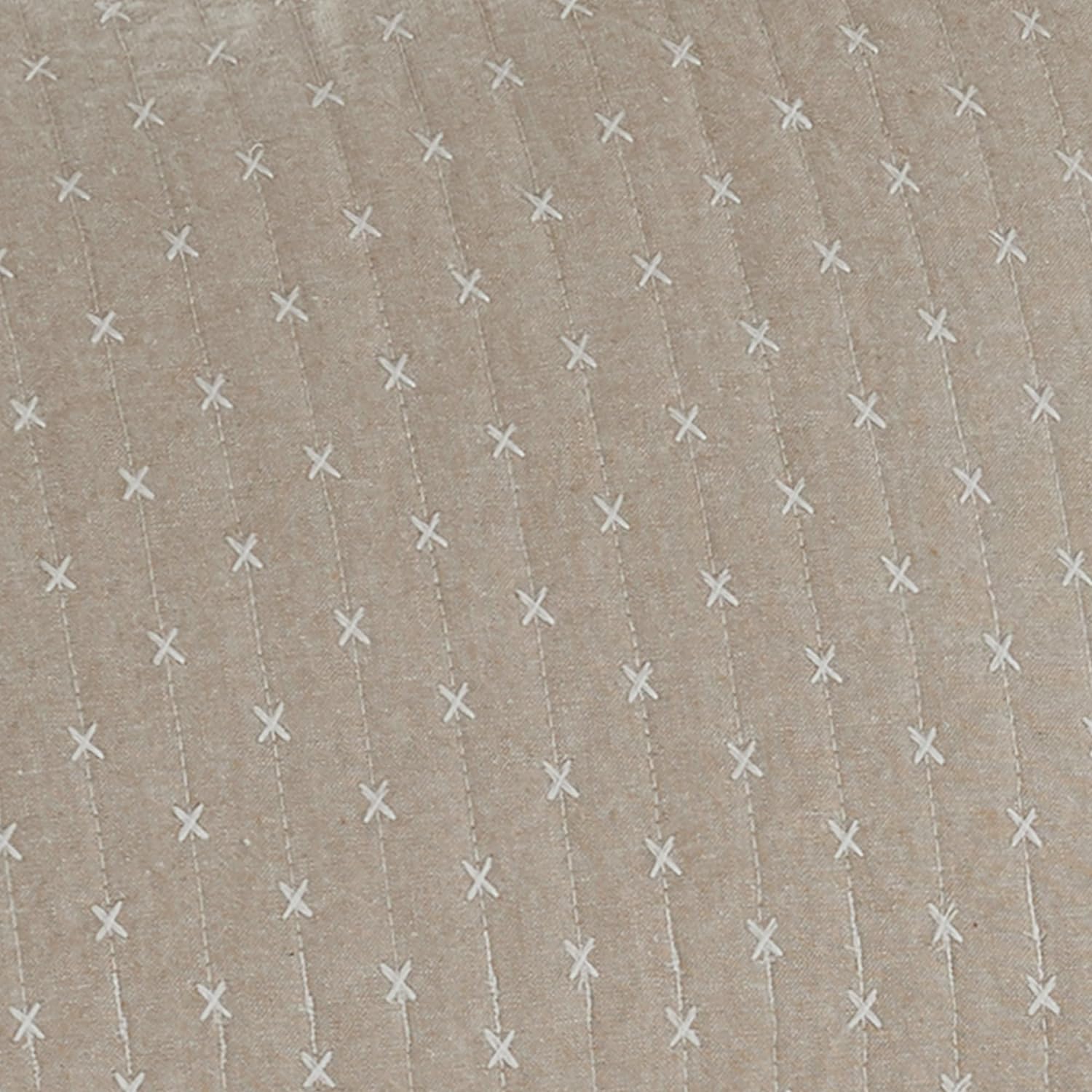 - THE CROSS STITCH TAUPE DESIGN: One of our most popular quilt sets, Cross Stitch Taupe is inspired by hand stitching techniques, with a taupe cross stitch quilt design and a charming reverse pattern of the same design. A bound border provides contrast and texture to complete the look. The matching shams are randomly cut from the same fabric as the quilt, making each sham unique and not identical to any other sham.