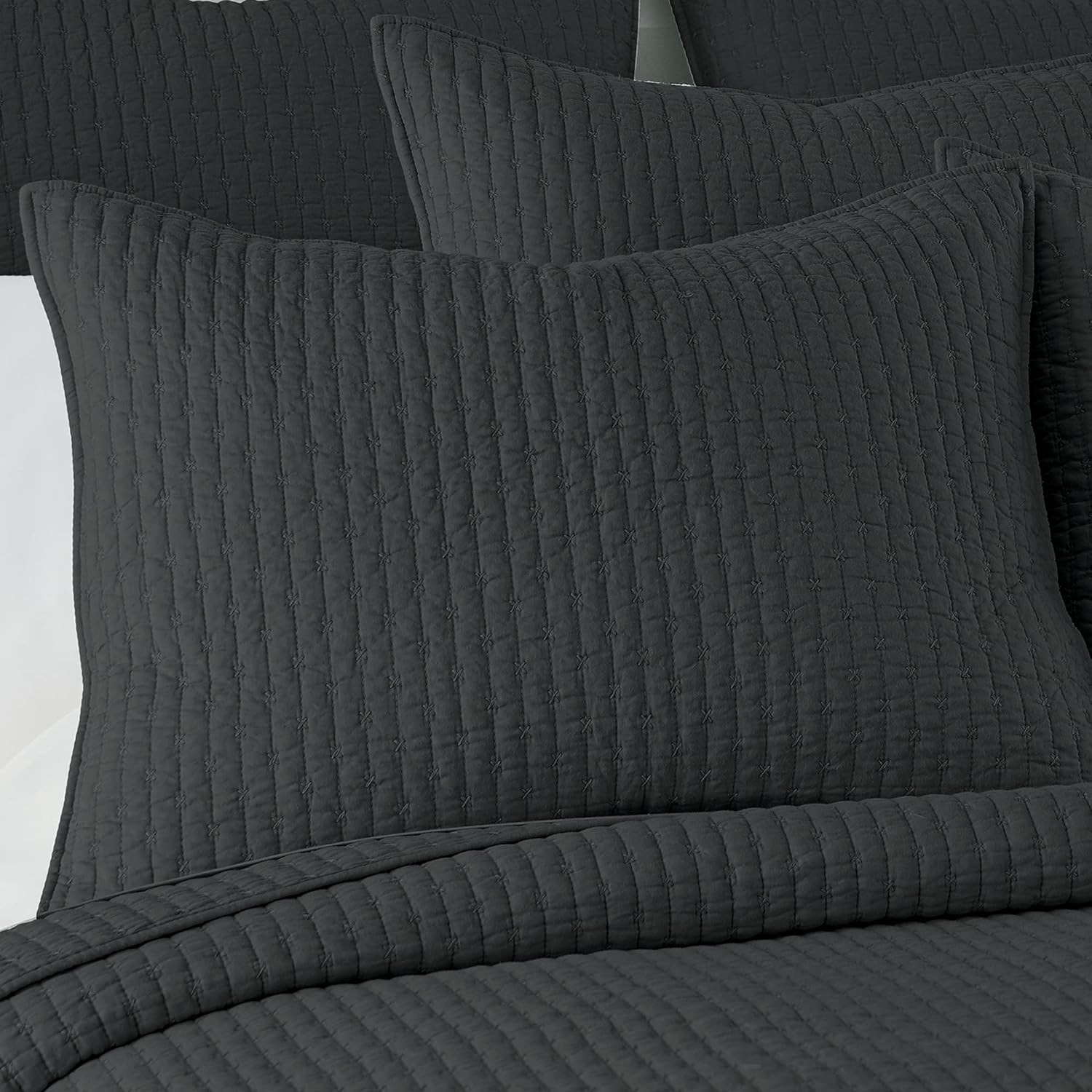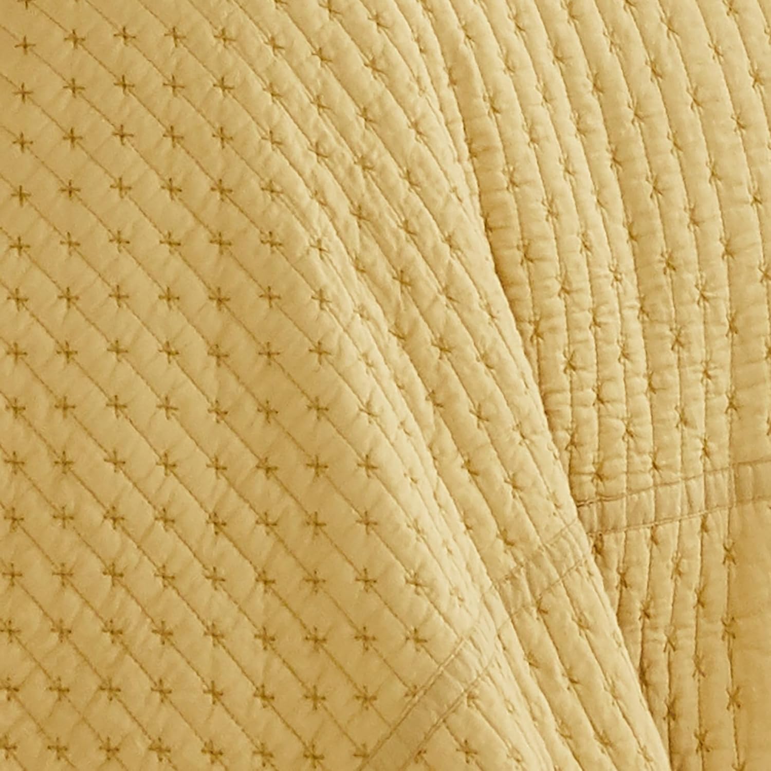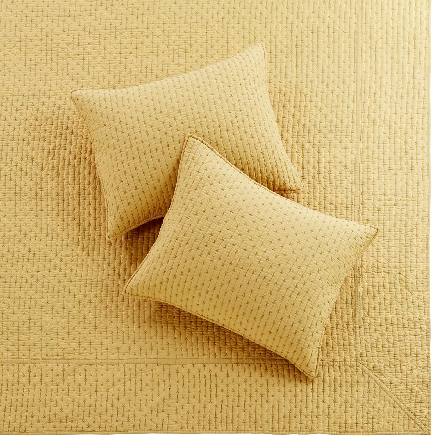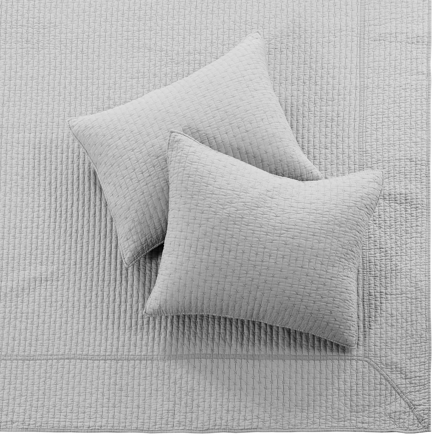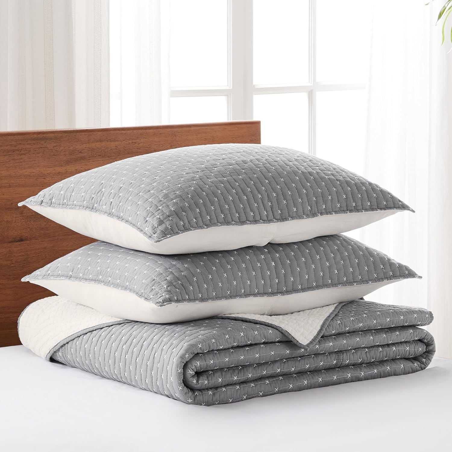 - THE CROSS STITCH TAUPE DESIGN: One of our most popular quilt sets, Cross Stitch Taupe is inspired by hand stitching techniques, with a taupe cross stitch quilt design and a charming reverse pattern of the same design. A bound border provides contrast and texture to complete the look. The matching shams are randomly cut from the same fabric as the quilt, making each sham unique and not identical to any other sham.