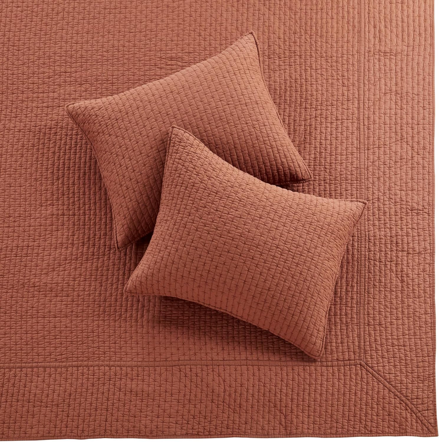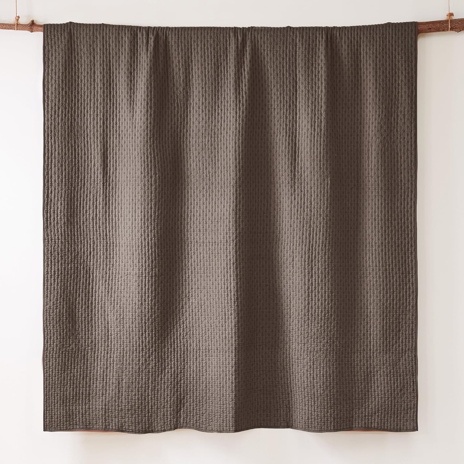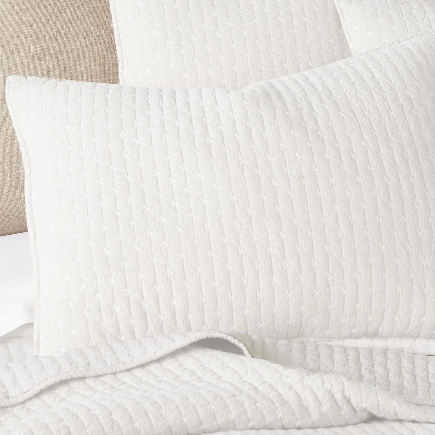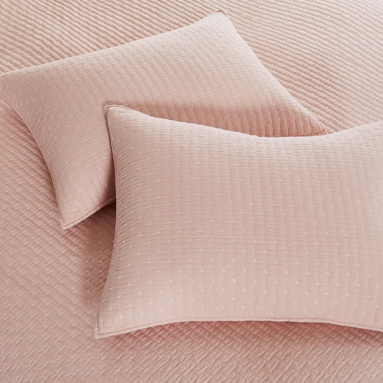 - THE CROSS STITCH TAUPE DESIGN: One of our most popular quilt sets, Cross Stitch Taupe is inspired by hand stitching techniques, with a taupe cross stitch quilt design and a charming reverse pattern of the same design. A bound border provides contrast and texture to complete the look. The matching shams are randomly cut from the same fabric as the quilt, making each sham unique and not identical to any other sham.